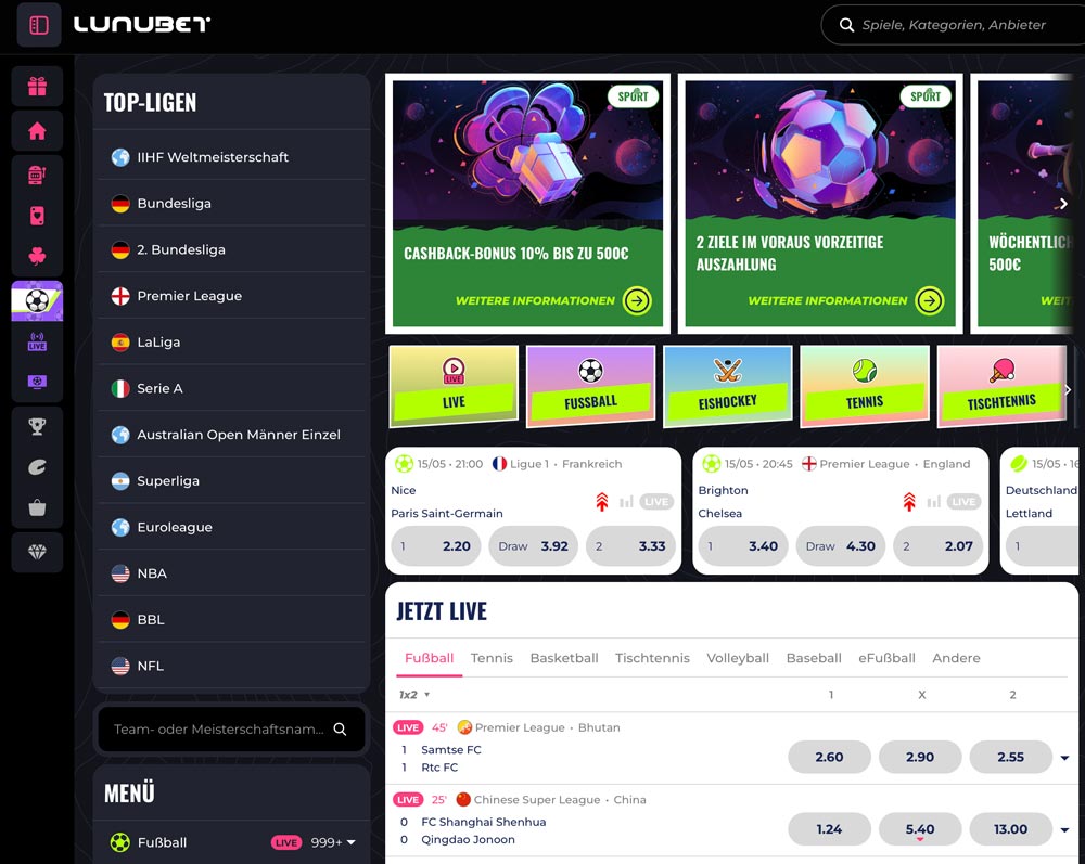 Fast alle Lunubet Wettscheine können vorzeitig mit der Cashout-Funktion abgerechnet werden. Nach unseren Lunubet Erfahrungen erfolgen die Cashouts immer vollständig. Nicht zu vergessen ist Bet Builder. Der Lunubet Wettkonfigurator ermöglicht es Ihnen ausgewählte Wettoptionen in einer matchbezogenen Kombiwette zusammenzufügen.