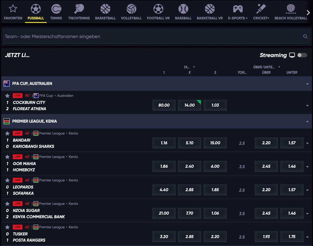 Die wichtigste QuickWin Sportart ist natürlich Fußball. In unserem Check haben wir weltweit kein relevantes Match vermisst. Alle Partien, egal aus welcher Liga, sind im QuickWin Programm zu finden. Klar ist, dass die großen Wettbewerbe wie die Champions League, die Bundesliga oder die Premier League auch bei QuickWin im besonderen Fokus stehen. Positiv ist jedoch, dass der Wettanbieter auch die unterklassigen Ligen nicht vernachlässigt. In Deutschland können zum Beispiel bis zur fünftklassigen Amateur-Oberliga Fußballwetten platziert werden.