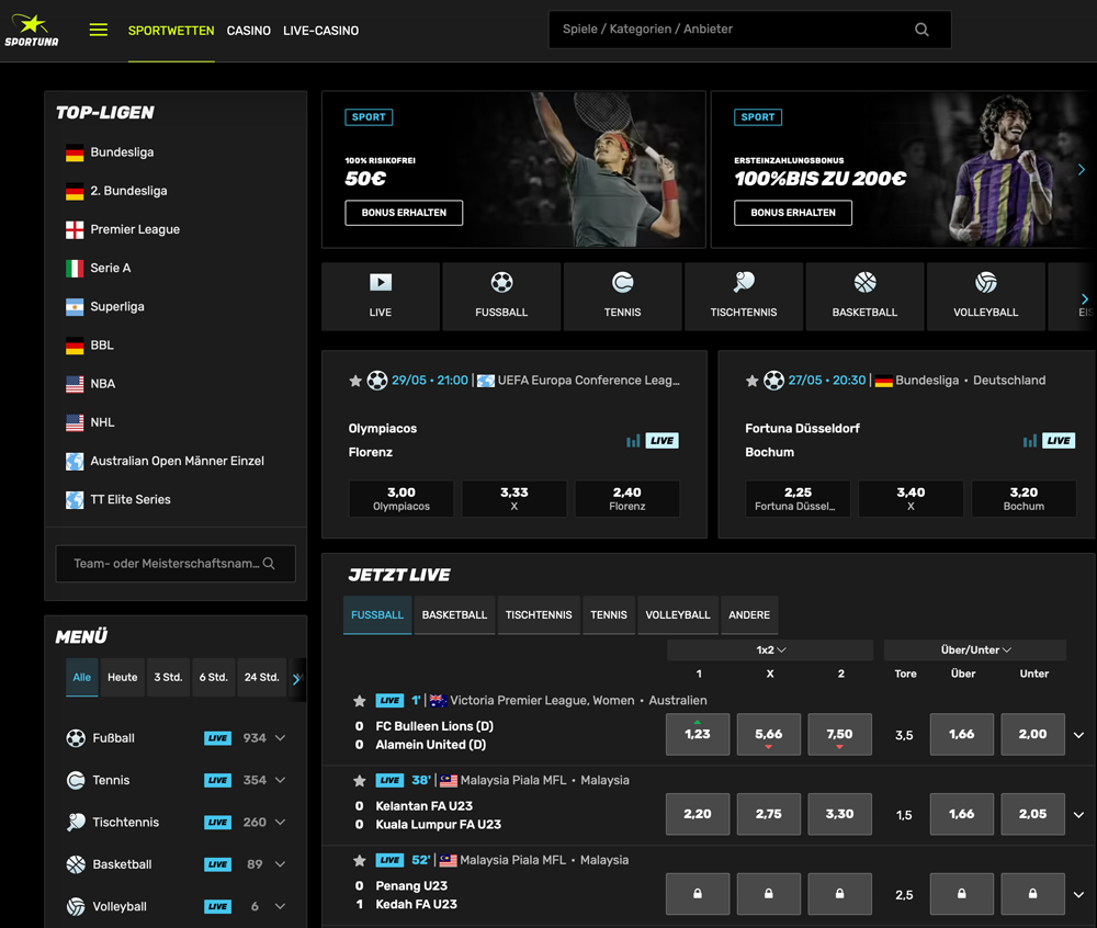 Blickt man auf die wichtigsten Sportarten bei Sportuna, so steht Fußball natürlich an der Spitze. Sie werden keine Fußball-Begegnungen weltweit im Wettangebot vermissen, egal ob Sie ihre Tipps auf die Champions League, die Bundesliga, die Premier League oder die zweite Liga in Thailand platzieren wollen. Fußballwetten gibt’s rund um den Globus, in den höchsten Spielklasse, gespickt mit zahlreichen Wettofferten aus niedrigen Ligen und dem Nachwuchsbereich. Ähnlich reichhaltig sind die Tennis-Wetten bei Sportuna vertreten, angefangen von den Grand Slams über die Masters Turniere bis hin zu den kleineren ITF Future Veranstaltungen. Es können Tipps auf Einzel- und Doppelspiele platziert werden.